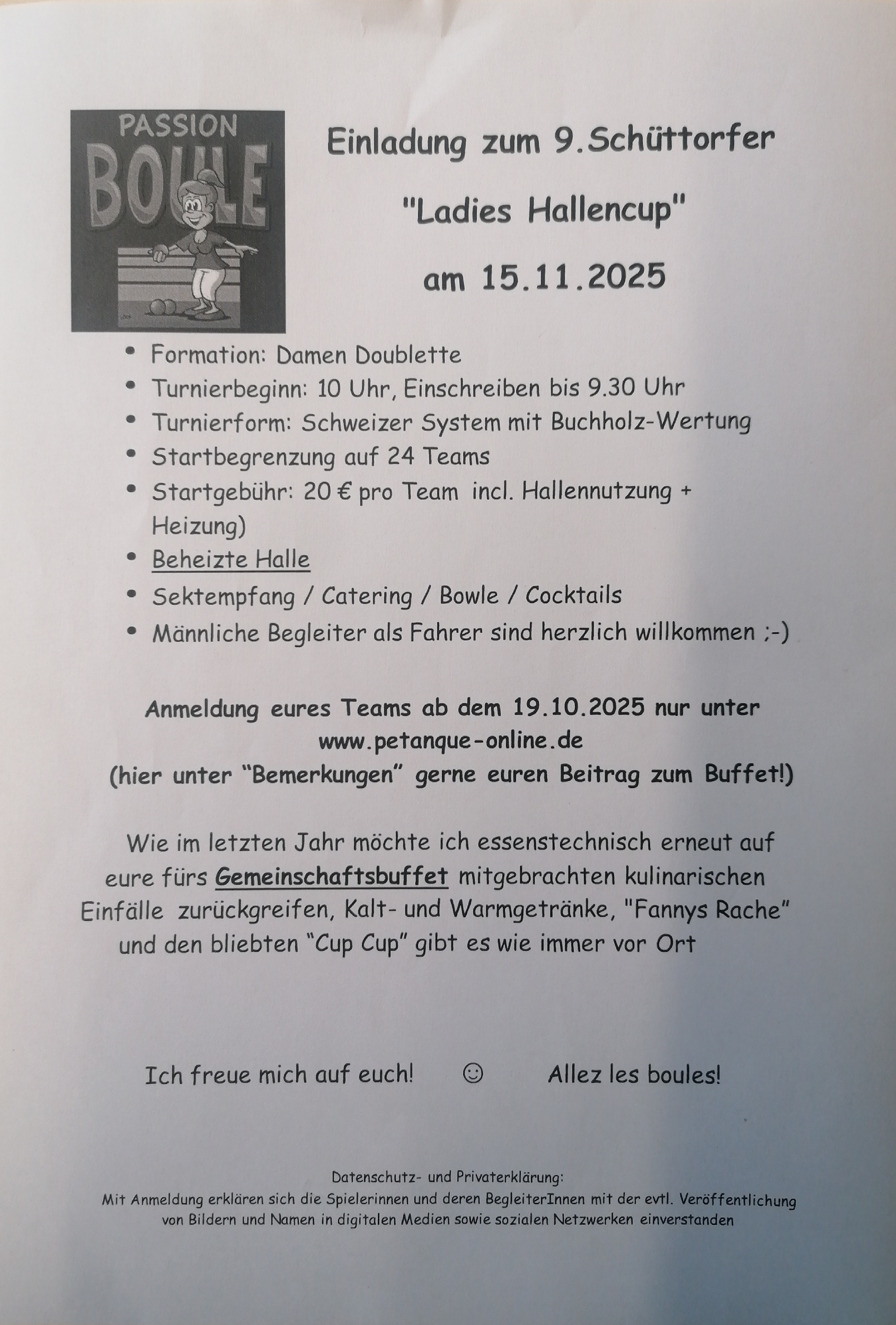 | 15 Nov Sa | 3. Westpark Turnier 2025 | Boulodrom Westpark Dortmund | PTSV Dortmund e.V. 1926 | Triplette Mixed | nein | Plätze frei | 12 | 25 | |
