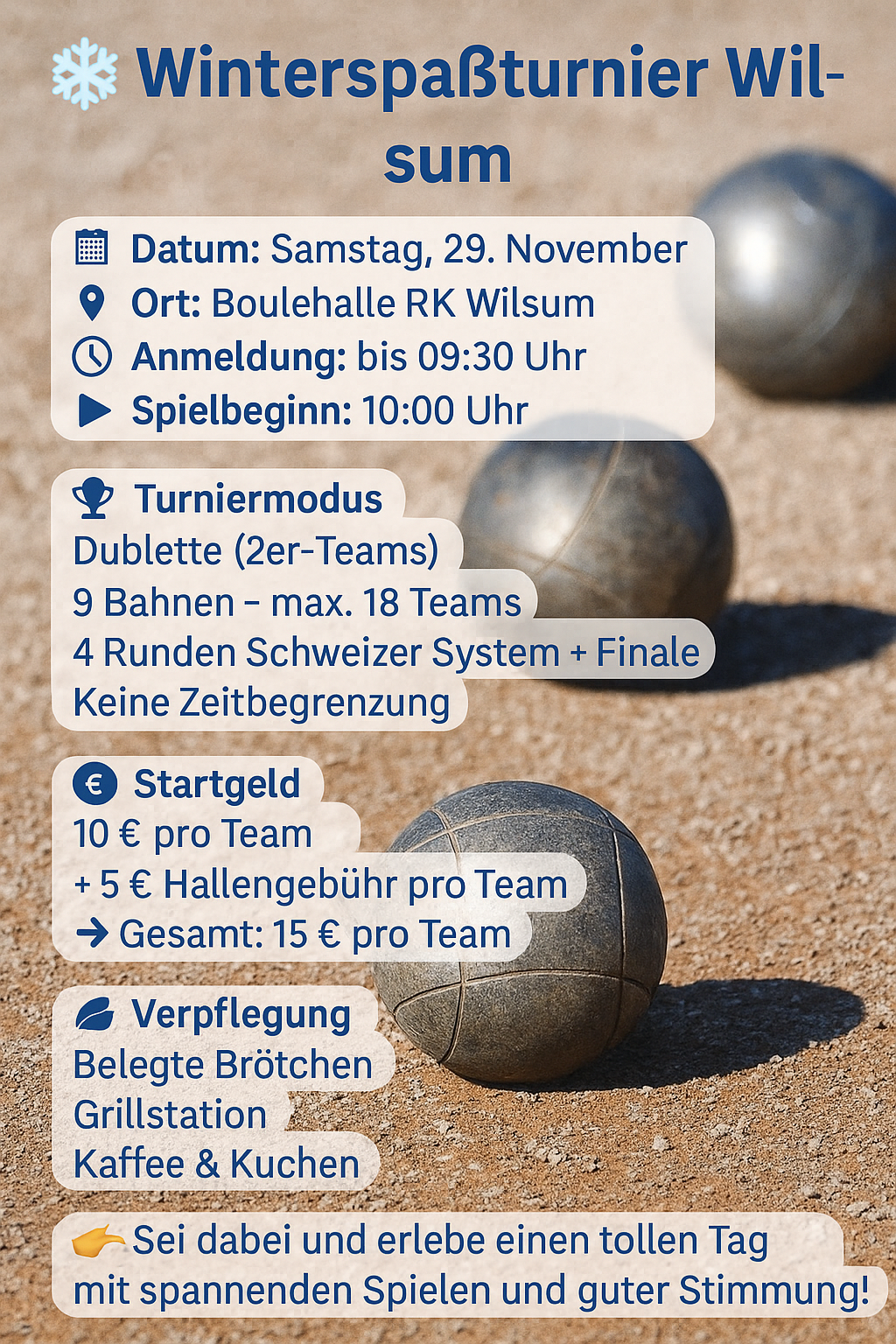 | 29 Nov Sa | Winter Spaßtunier | Wilsum Boulehalle | GPV (Grafschafter Pètanque +Sport e. V) | Doublette | nein | Nachrücker | 0 | 18 | |